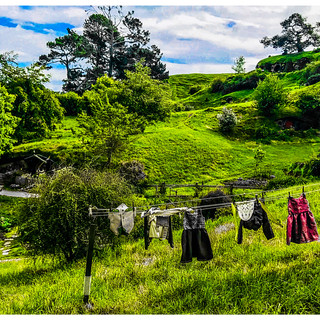 Au départ de la Péninsule de Coromandel, c’est la pluie et le vent qui nous saluent. On se dit que ça va être sympa de visiter Hobbiton sous la pluie. Hobbiton est le lieu du tournage des scènes du village des Hobbits qu’on peut voir dans les deux Trilogies (Le Seigneur des Anneaux et The Hobbit) de Peter Jackson. La visite ne peut se faire qu’avec un guide. C’est en 1998 que Peter Jackson en survolant le ciel de la région de Matamata décèle le lieu idéal pour y implanter le village des Hobbits de sa future trilogie du Seigneur des Anneaux. C’est en fait le terrain de la ferme d’un particulier. Pour la petite histoire, il semblerait que Peter Jackson ait sonné à la porte de Russell Alexander, propriétaire du terrain, un samedi après-midi jour de match de rugby. L’histoire veut qu’il ne lui ait pas ouvert la porte. Star d’Hollywood ou match de rugby, la confrontation ne tient pas pour les Kiwis !