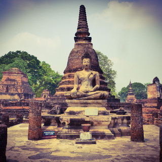 Avant ça, c’est à vélo que nous irons visiter le parc nord de Sukhothai. Il nous a fallu un moment avant de trouver l’entrée ! Nous avons d’abord visité un Wat « on sait plus quoi » mais c’était plus des briques empilées qu’autre chose. Non on est pas blasé ! Sincèrement, le temple était vraiment pas terrible ! On visitera ensuite le Big Buddha qui rattrapera bien la déception du temple précédent ! Imposant, majestueux, il s’est fait chercher mais il méritait le détour.